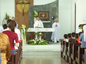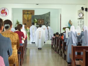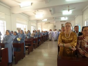 Thánh Lễ tạ ơn do cha Quản Hạt- Giáo hạt Tân Mai chủ tế, cùng với các cha dâng lễ cho công đoàn, cha giảng tĩnh tâm và các cha thân quen với cộng đoàn. Có đông đảo quí thân nhân của các em Tập Sinh, quí ân nhân và tất cả chị em trong cộng đoàn tham dự. Thánh Lễ được cử hành thật sốt sắng và ấm áp trong ngôi nhà nguyện nhỏ bé thân thương. Lời chia sẻ Tin Mừng của Cha Quản Hạt đã dẫn mọi người trở về với chính lòng mình để nhận ra biết bao hồng ân Thiên Chúa đã ban dư tràn trong cuộc đời từng người qua nén bạc khả năng, sức khỏe, niềm vui, bình an và nhất là ân huệ sự sống Chúa đã ban nhưng không cho chúng ta.